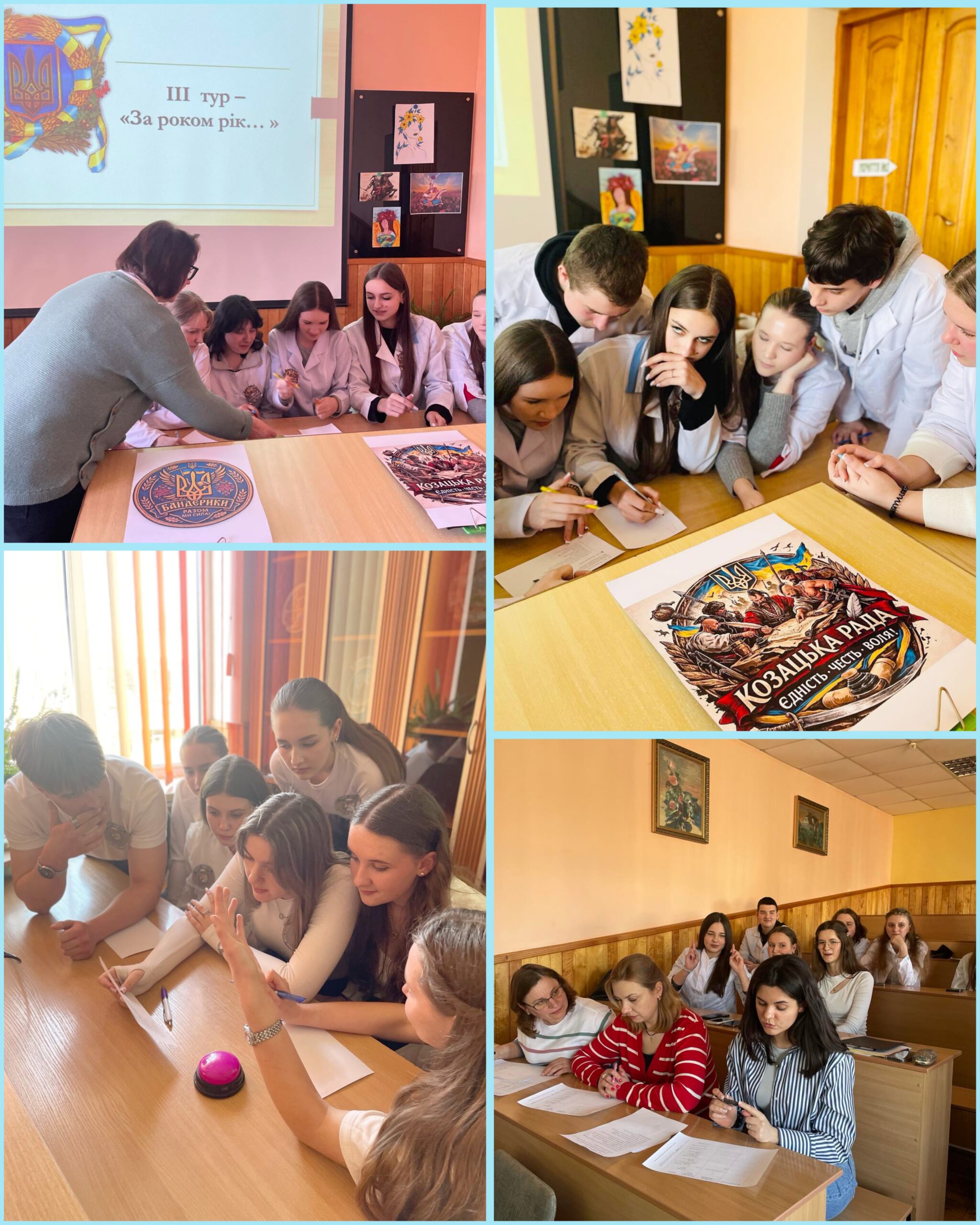 Свої знання, уміння та творчий підхід продемонстрували студенти першого курсу ОПП «Лікувальна справа». Дві команди, «Бандерики» групи АЛ-109 та «Козацька рада» групи БЛ-109, у різнопланових конкурсах показали не лише знання ключових подій історії, а й уміння логічно викладати та обґрунтовувати власну точку зору, проявили кмітливість і винахідливість.